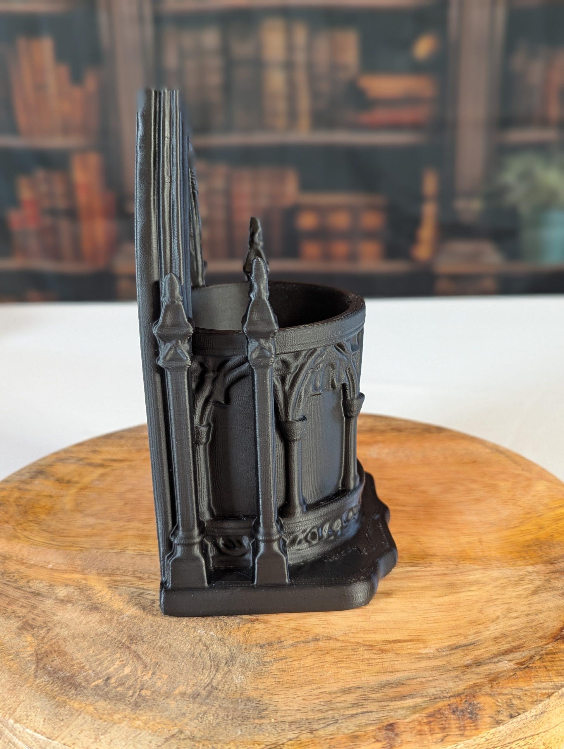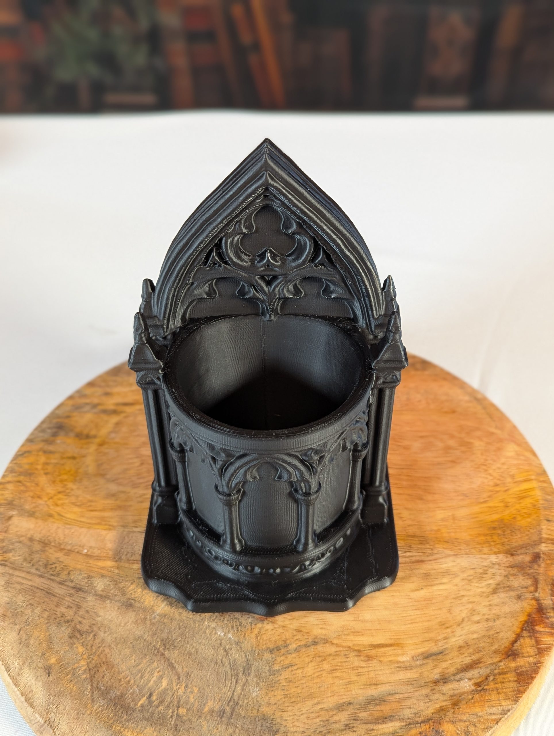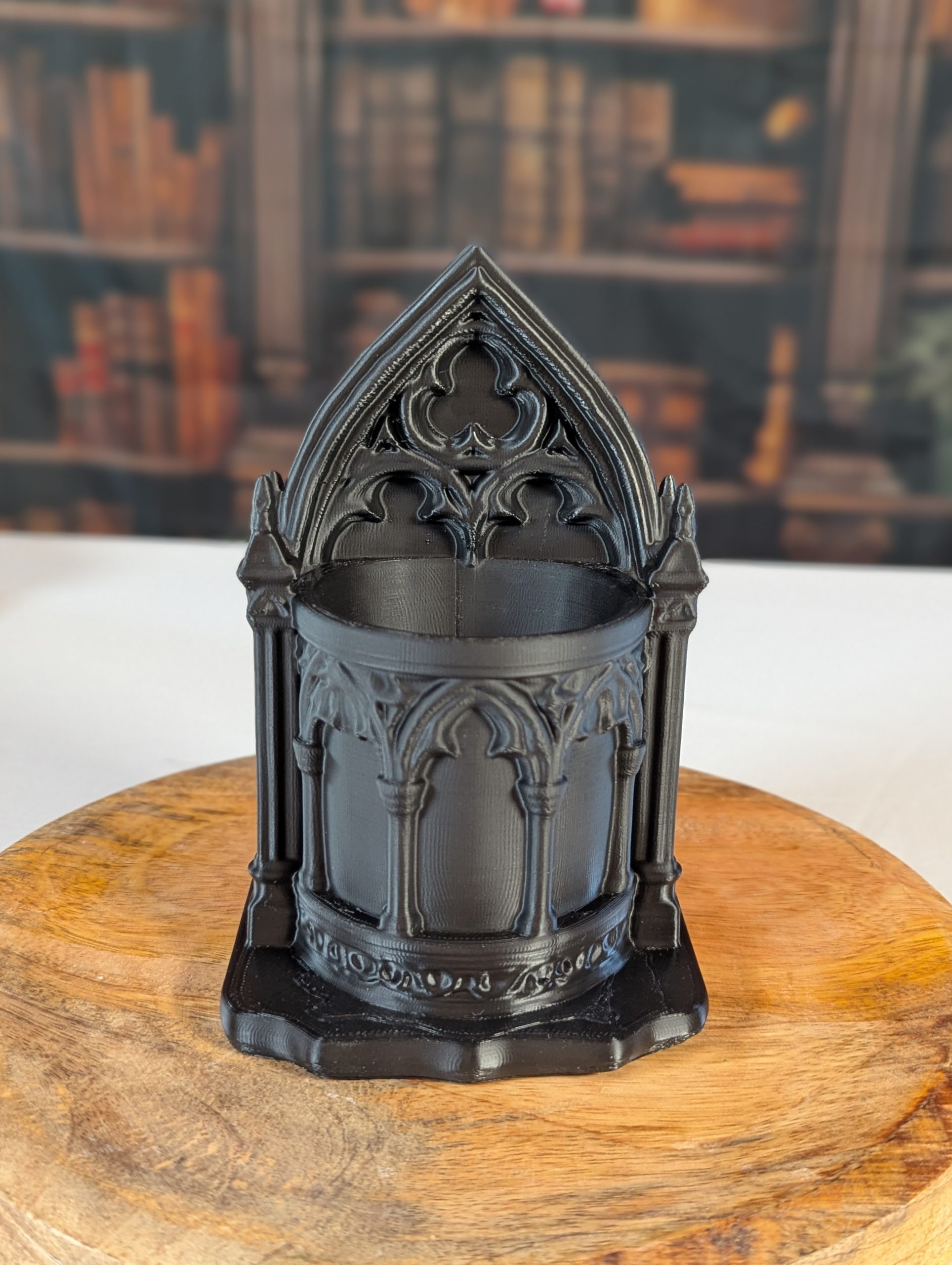 Dieser detailreiche Stifthalter im gotischen Stil erinnert an die Fenster und Bögen alter Kathedralen. Mit seinen filigranen Ornamenten und der dunklen Farbe bringt er eine mystische Atmosphäre auf deinen Schreibtisch oder in dein Bücherregal.